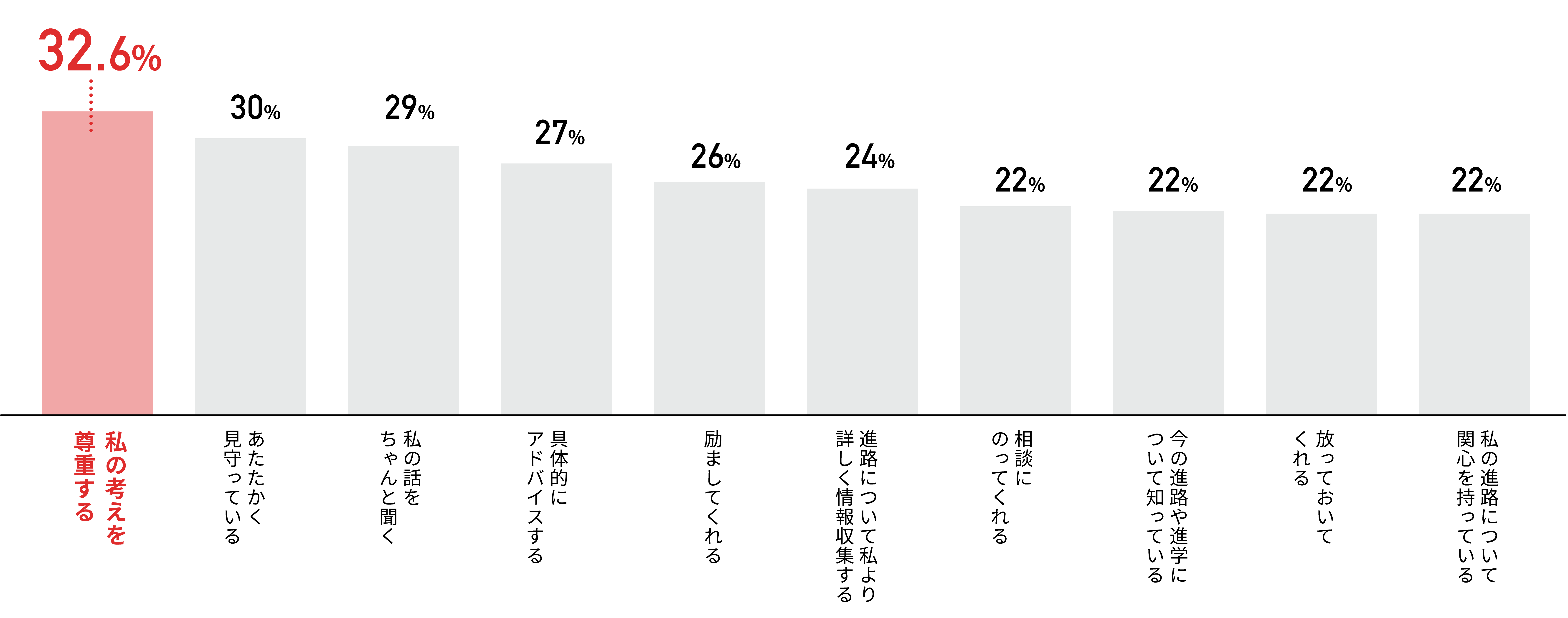 高校生が保護者に求めるのは、「自分の考えを尊重してほしい」「あたたかく見守ってほしい」といった精神的なサポートが約3割で上位に。