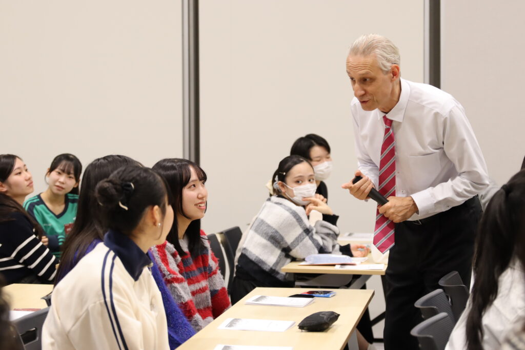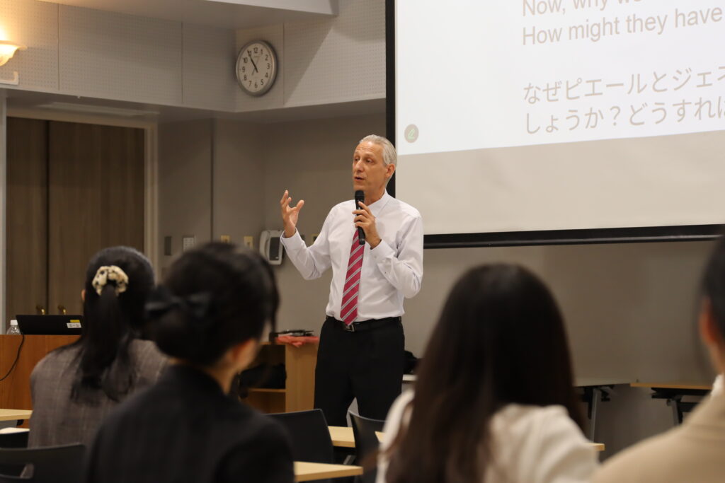 講演は日本語と英語を交えながら行われ、文化の違いを読み解くキーワードとして High Context(ハイコンテクスト)と Low Context(ローコンテクスト)が登場しました。日本や先生のご出身であるフランスは、行間や空気を重視するハイコンテクスト文化である一方、世界にはアメリカなど明確に言葉で伝えるLow Context文化も存在し、こうした前提の違いを理解していないと、コミュニケーションに誤解が生じてしまう——その重要性を、具体的な事例を挙げながらわかりやすく説明してくださいました。また、お互いの文化を理解するために、留学やインターンシップに挑戦して多様な価値観に触れることの大切さもお話いただきました。