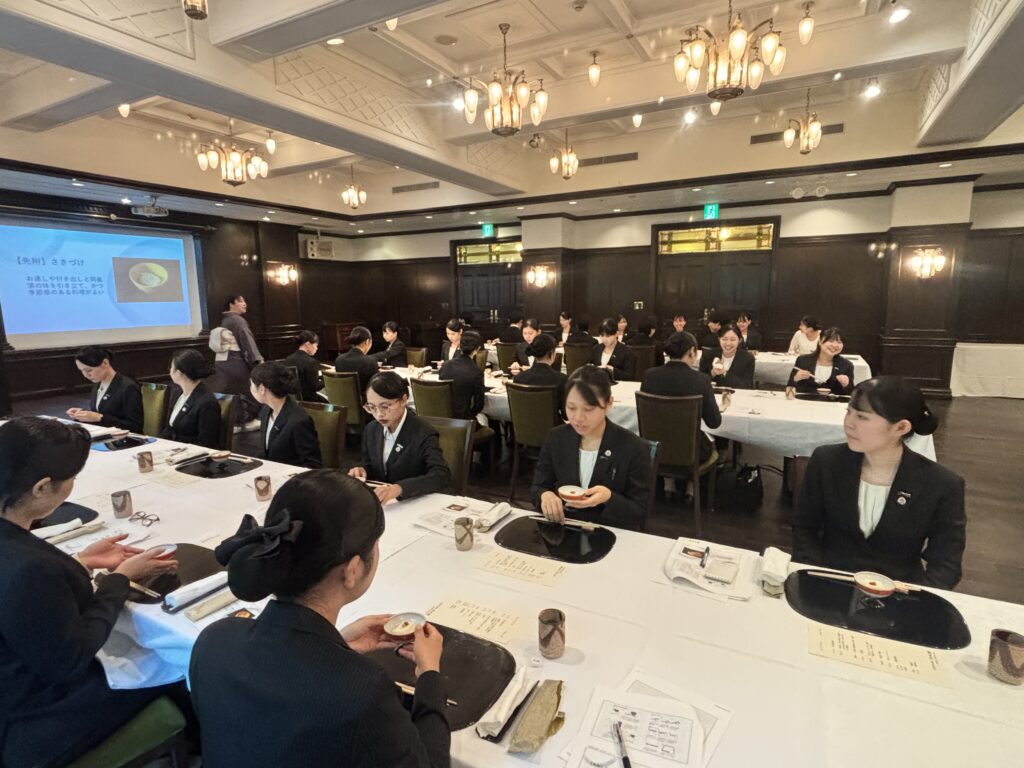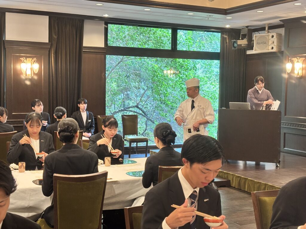 今回の研修では、若女将・久保田様より日本料理の接客やおもてなしについてご講話いただいた後、実際に料理をいただきながら、調理部長・藤村様より食事マナーを学ぶ時間も設けられました。学生たちは、日本料理の知識・マナーの習得にとどまらず、国内外のお客様へ料理の魅力をお伝えできるよう、日本料理が持つ文化的な背景や、食材の特徴、食事作法など、サービススタッフとして必要となる知識を幅広く学び、日本料理を体系的に理解する貴重な体験となりました。