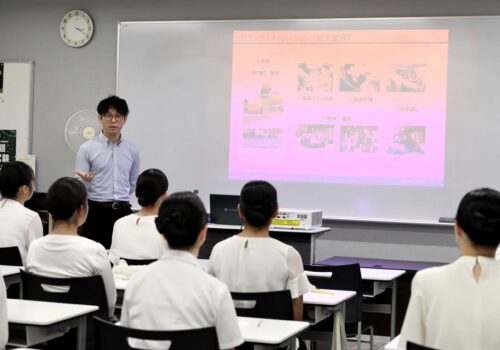 スピーキング力・リスニング力の強化を目的に、学科の学びに即したオリジナル教材によるオンライン英会話レッスンを導入しています。自宅レッスンでは、学生の英語レベルによって内容を柔軟に変えることができ、初心者から上級者まで自分のレベルに合った学習ができます。